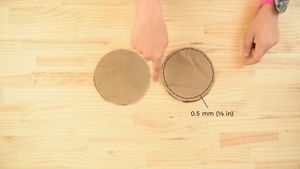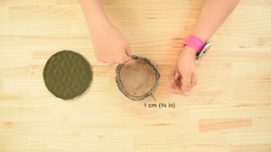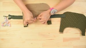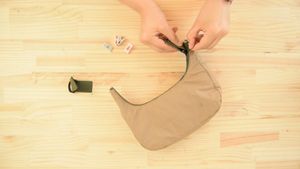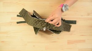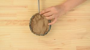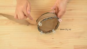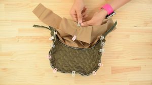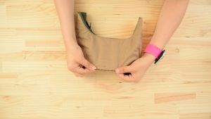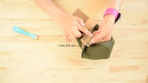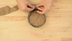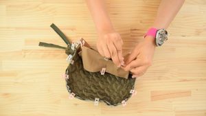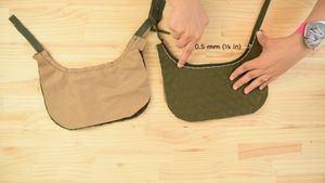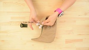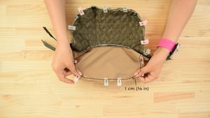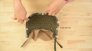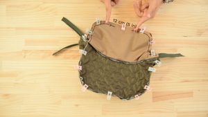 - Fold the bias end inward by 1 cm (⅜ in) and place around the bag.