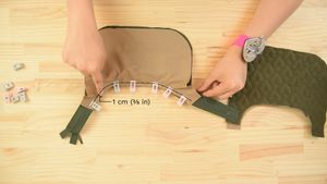 - Pin the webbing on the perimeter right sides together at a distance of 2 cm (¾in) from the zipper.